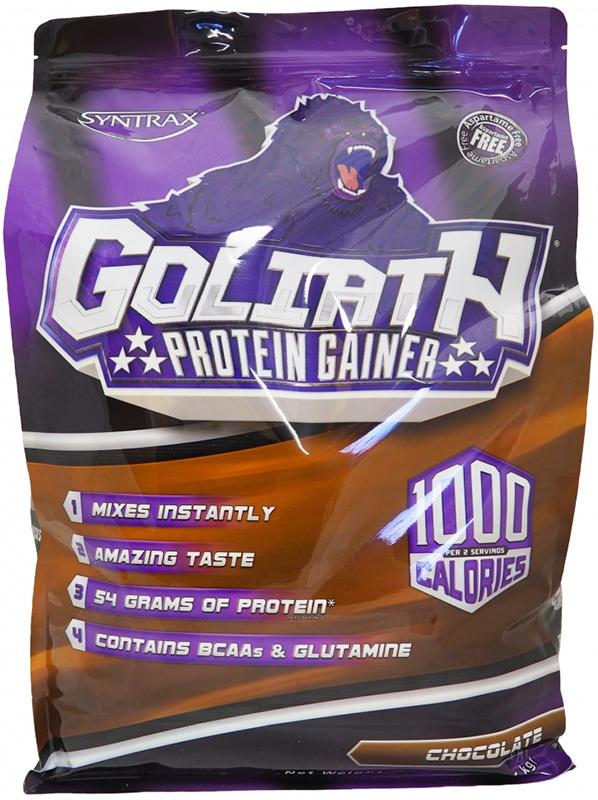 Syntrax Goliath – высококалорийный гейнер. 54 г белка и 192 г углеводов в каждой порции. Содержит сложные углеводы продолжительного воздействия и протеиновую смесь Colostrim. Для набора массы. Быстро смешивается.
